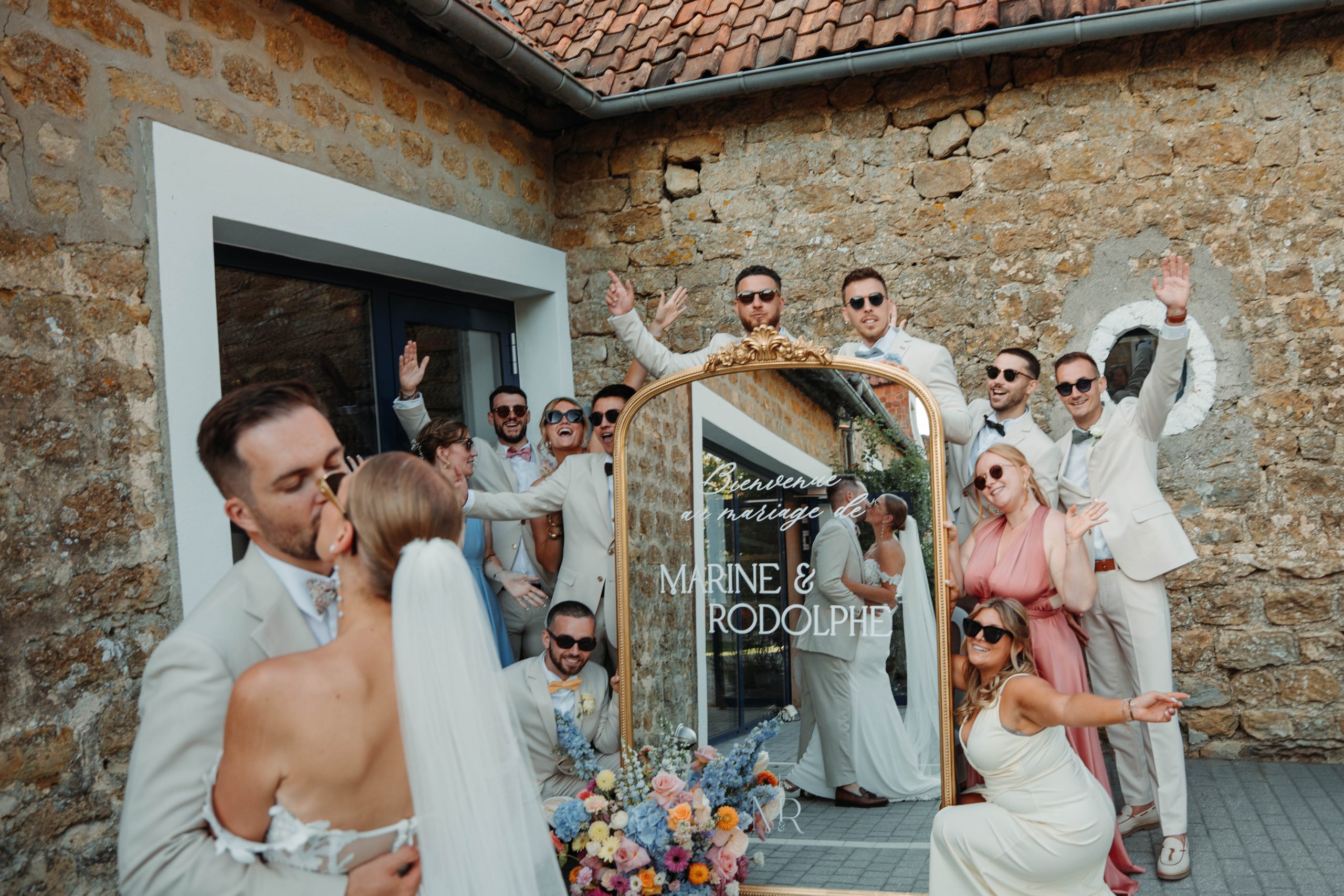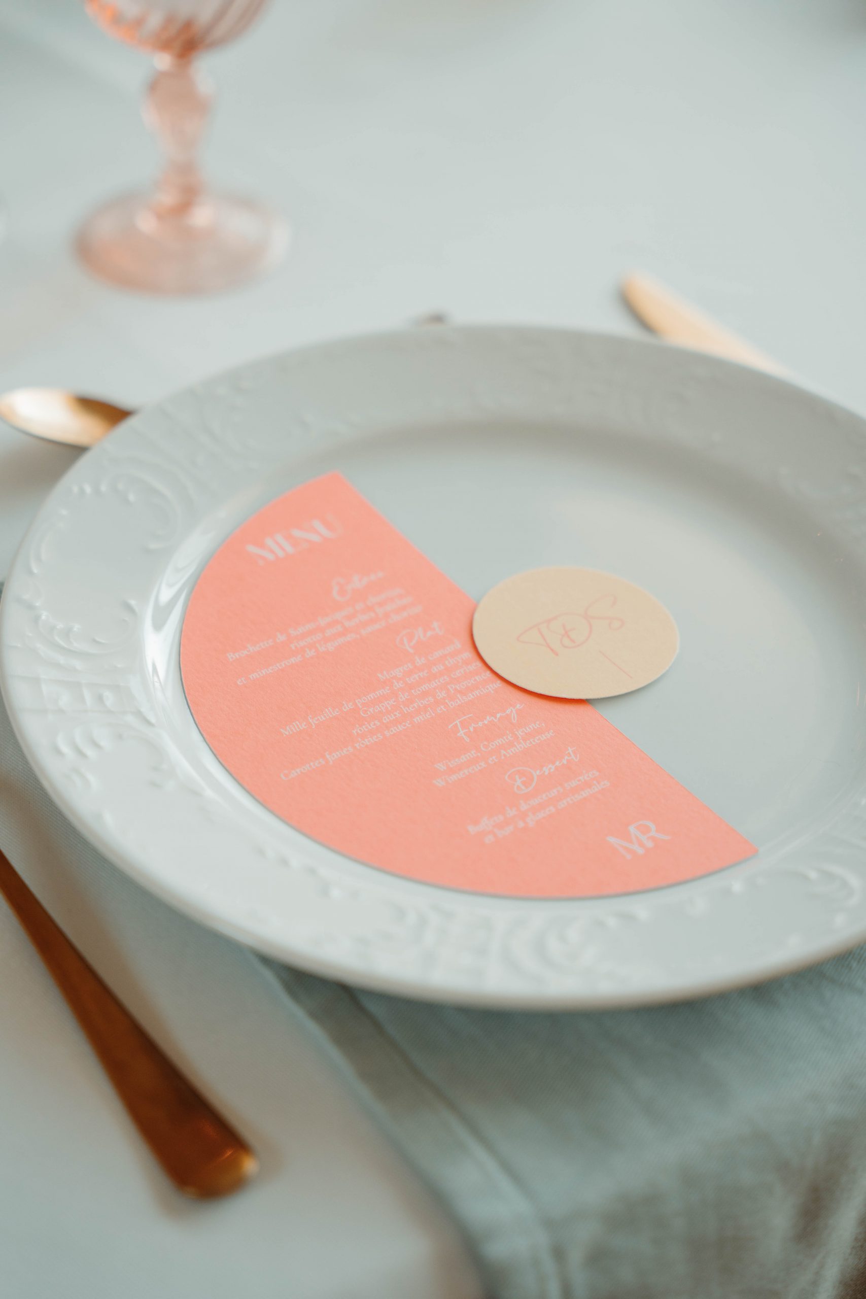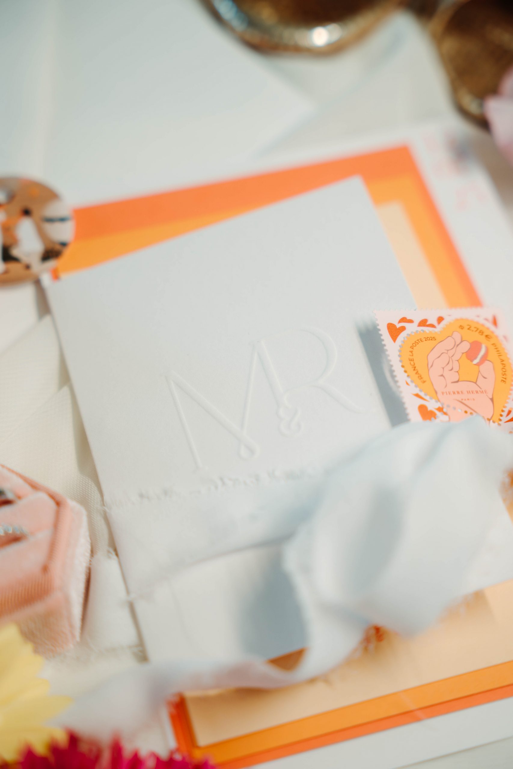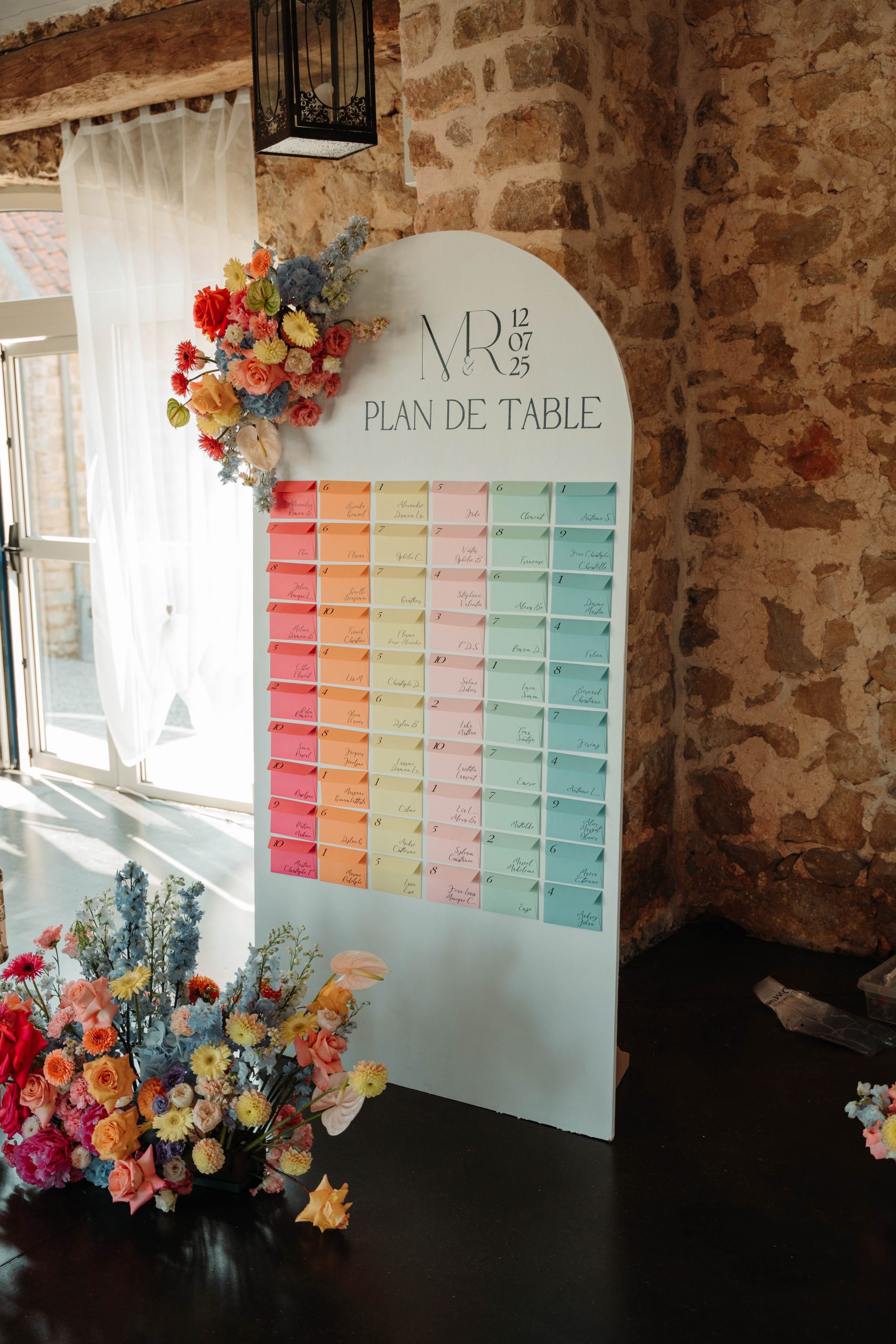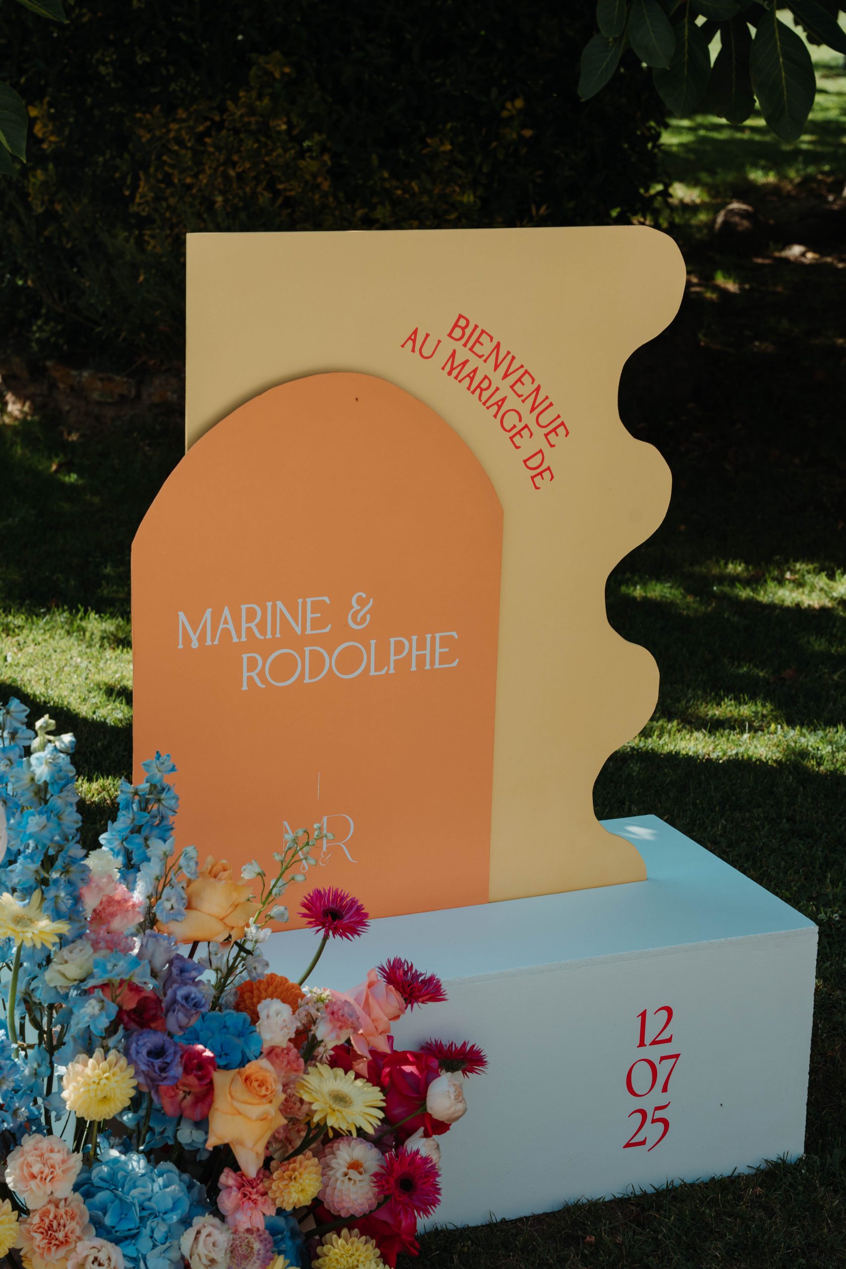 Marine, débordante d’énergie et de joie, a illuminé chaque instant, Rodolphe, plus discret mais tout aussi investi, a su garder son calme légendaire, tandis que Laurine de @viens on scene, avec son œil affûté pour le détail, a orchestré une décoration tout simplement incroyable : des couleurs en parfaite harmonie avec une papeterie absolument canon, pensée jusqu’au bout ! Les menus, parfaitement intégrés à la vaisselle, reprenaient la forme de l’assiette — un détail audacieux et élégant qui a fait sensation. Partout, le logo du mariage et le code couleur rappelaient leur univers, et même leur fidèle Titus a eu droit à un clin d’œil plein de tendresse. Après tant d’émotions et de préparatifs, tout s’est aligné : un mariage vibrant, raffiné et profondément à leur image ! tous nos vœux de bonheur !